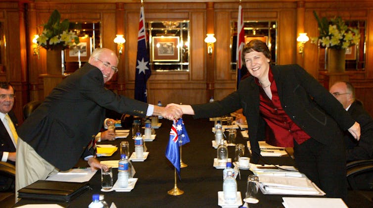 Raw deals: the then Australian and NZ prime ministers, John Howard and Helen Clark, shake hands before bilateral discussions in Auckland in 2005